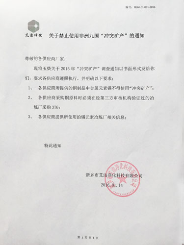 關(guān)于禁止使用非洲九國(guó)沖突礦產(chǎn)的通知 我公司提出關(guān)于禁止使用非洲九國(guó)沖突礦產(chǎn)的通知,請(qǐng)各供應(yīng)商嚴(yán)格按照要求實(shí)施!